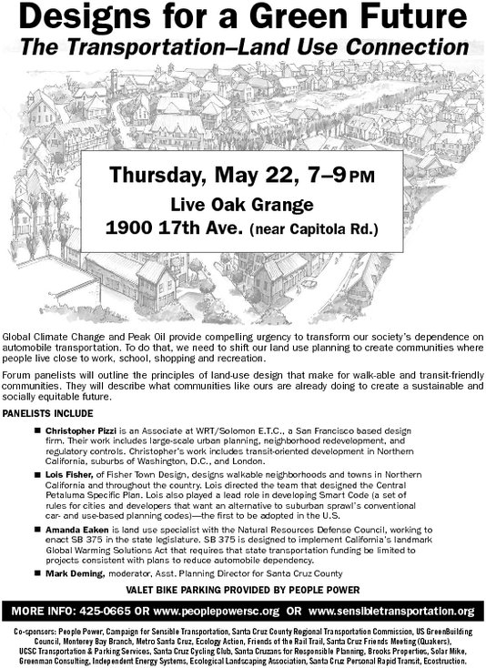 Forum panelists will outline the principles of land-use design that make for walk-able and transit-friendly communities. They will describe what communities like our are already doing to create a sustainable and socially equitable future.