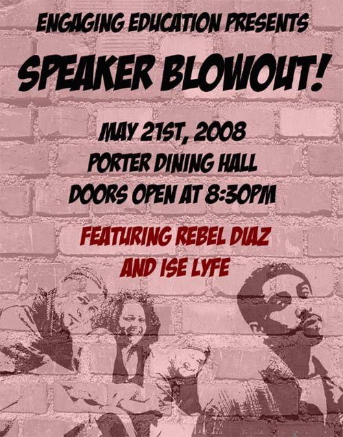 SPEAKER BLOWOUT is an annual UCSC event organized by students to create social, cultural, and political awareness surrounding issues that affect our communities. Previous speakers for this event [including Jesse Jackson, Bobby Seale, Saul Williams, and Chuck D] have addressed issues regarding race and access to education.