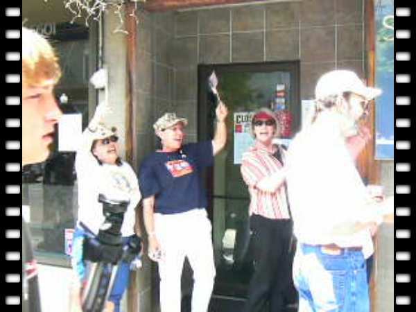 The crowd lined both sides of Shattuck near the Marine Recruitment Center. A small ground of Code Pink bicyclists circled several times as did a few bikers (one of whom drove close behind the bicyclists and continuously revved his engine). Around noon or one, the Berkeley police decided to push all anti-war protesers (and several journalists) out of the crowd of bikers directly in front of the recruitment center. Most police lined the opposite side of the street eating popsicles but a few of those who were pushing anti-war protesters mingled with the bikers and almost seemed to be part of the pro-marine group.