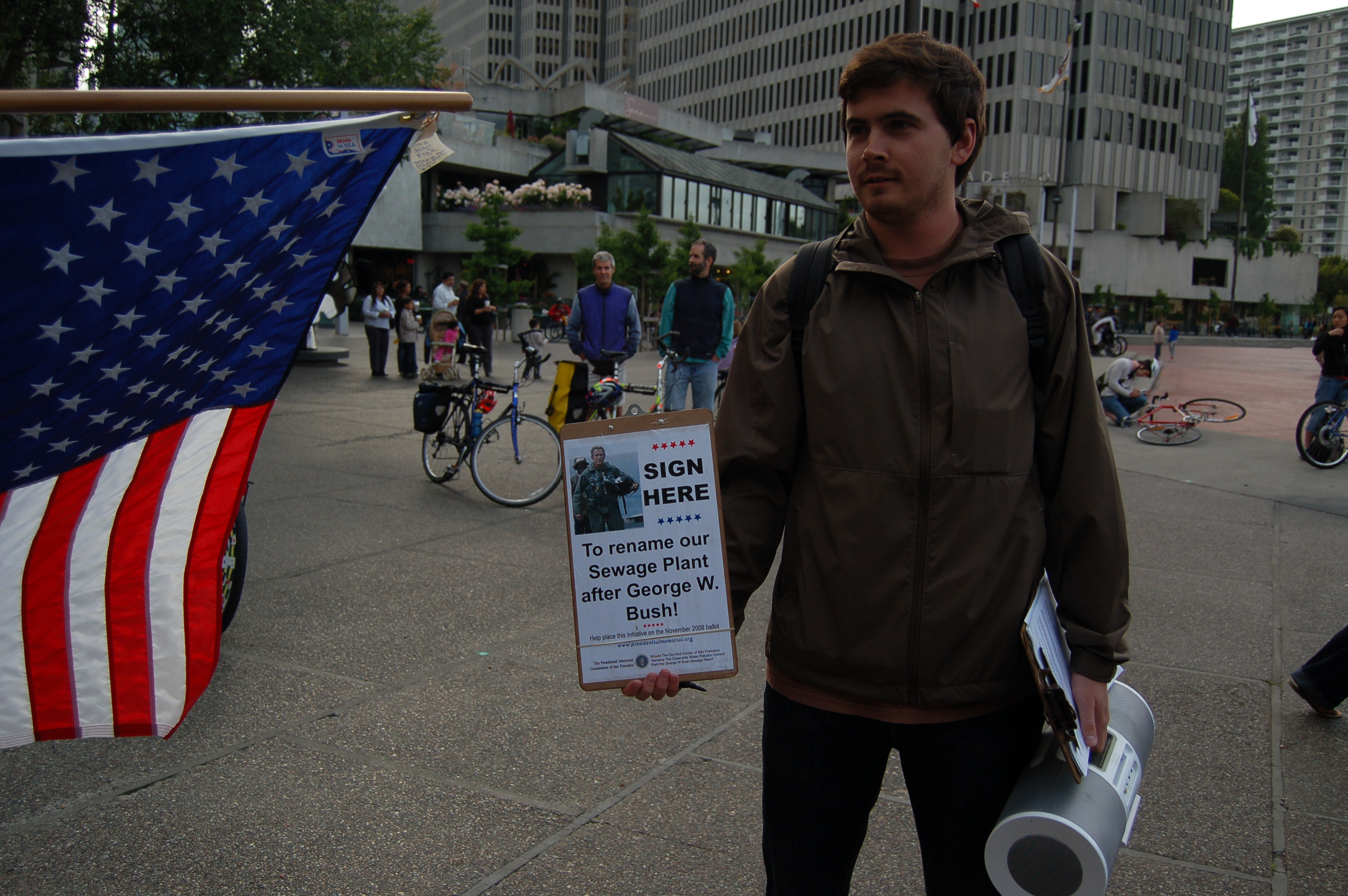 The Presidential Memorial of San Francisco is a group of San Francisco residents, who are trying to get an initiative on this November ballot, for the renaming of the Oceanside Water Pollution Control Plant, to the George W Bush Sewage Plant.