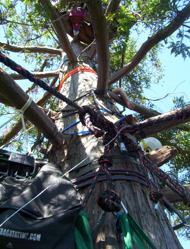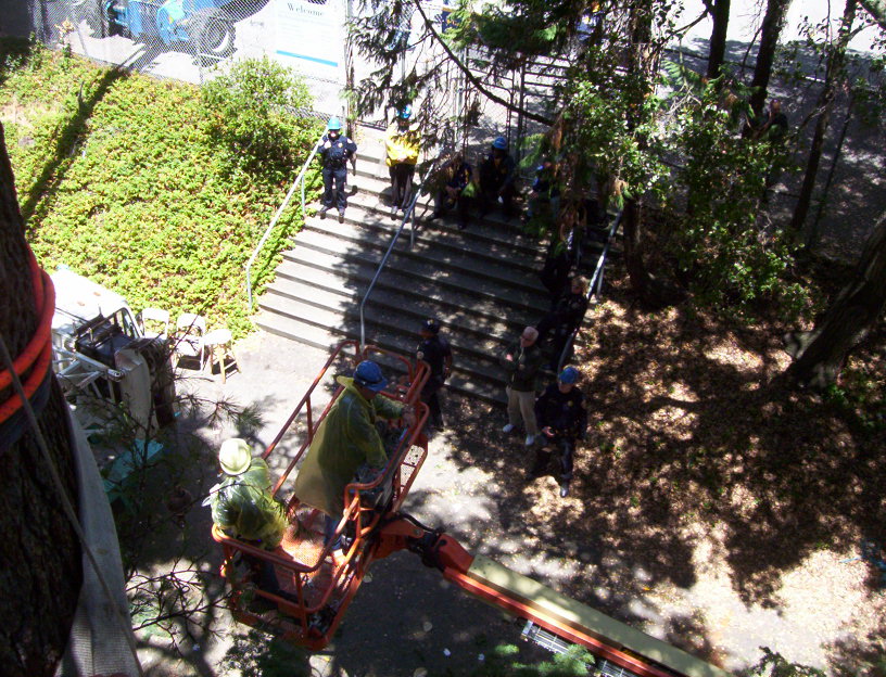 As the day wore on we got tired but so did the extractors. They took several breaks the came for us again. They had become more aggressive and had come in larger numbers per cherry picker as our defense was working well. They took a long break at 3:00 and we thought that they were done for the day. Then they came one last time. There was a very spirited defense of the safety line between Redwood and Lower Diodar. Two tree sitters grabbed the pole saw when the arborists tried to use it and the extractors discarded it. Then a roll of super strong tape and a rope were snatched away and the rope was saved many times. After a struggle with a second rope the extractors went away.