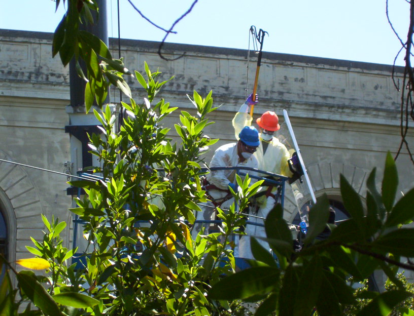 While a Dumpster Muffin stood at the top of the redwood tree she was approached numerous time be a large basket hanging from a crane. They repeatedly approached her and she could easily have fallen. Her shouting and putting her life in the way of danger helped convince the extractors to back off from Redwood.