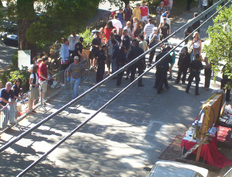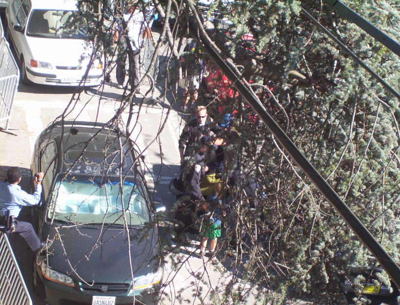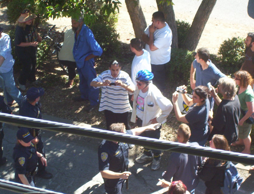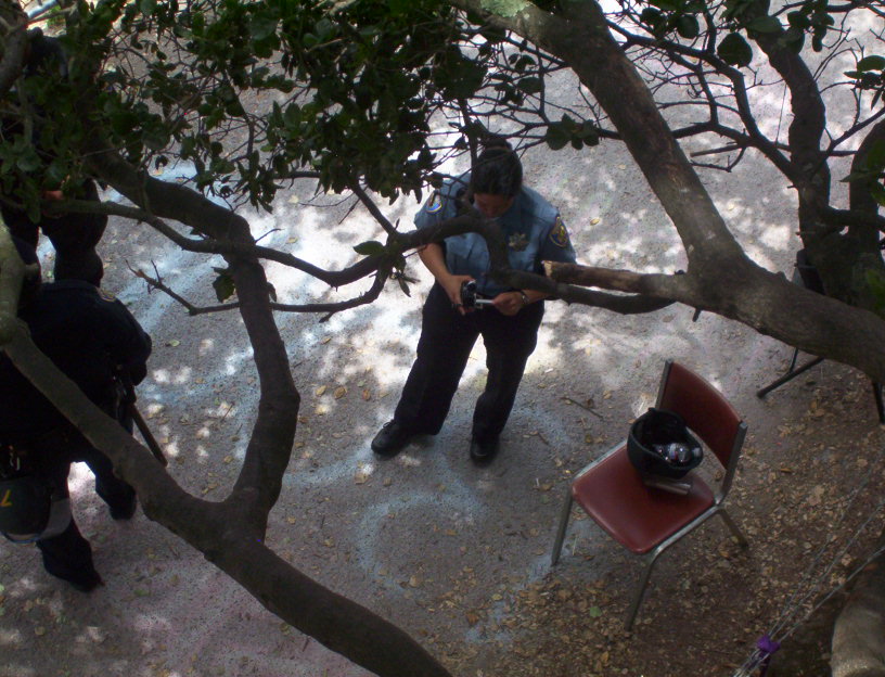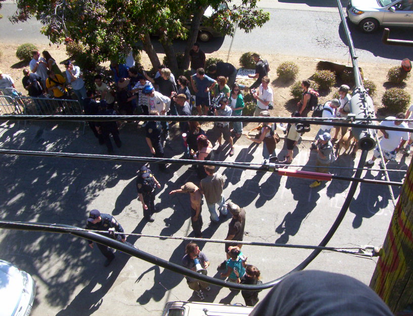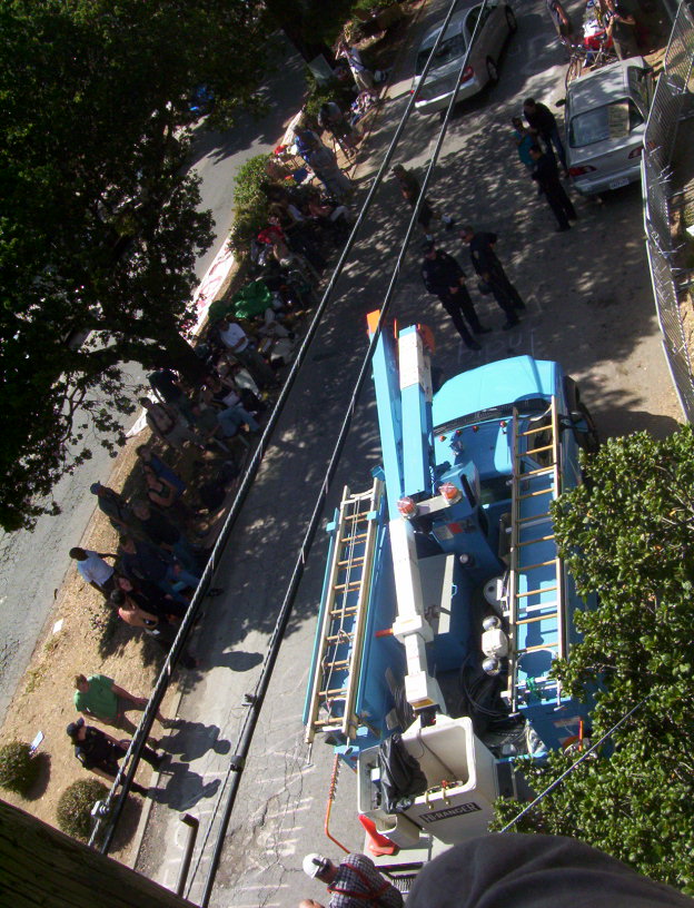 The last main day of extraction as June 19. The extractor did not come in the morning but did come in the afternoon. The managed to get one tree sitter, Leaf. The cut all of our lines again and Mando and I only managed to escape by my going out to a telephone pole and his going up into tiny branches of an oak. I was cut off and all the safety lines were cut. I was scared of the extreme danger to get back to the others. Later that night I decided to come down. I made a deal to get me stuff out to supporters and they posted many of my photos while I was in jail.