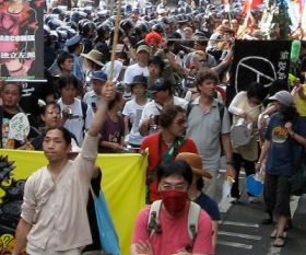 Japanese police continue to escalate repression against protesters of the Group of 8 Summit, part of a growing trend of human rights suppression in Japan. Police in full riot gear are supported by the Japanese Army, called the Self Defense Forces (SDF). Air and sea missions near the Summit are being carried out in a joint deployment of the SDF and the US military.
