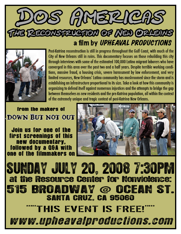 Post-Katrina reconstruction is still in progress throughout the Gulf Coast, with much of the City of New Orleans still in ruins. This documentary focuses on those rebuilding this city through interviews with some of the estimated 100,000 Latino migrant laborers who have converged in this area over the past two and a half years. Despite terrible working conditions, massive fraud, a housing crisis, severe harassment by law enforcement, and very limited resources, New Orleans’ Latino community has mushroomed since the storm and is establishing an infrastructure proportional to its size.