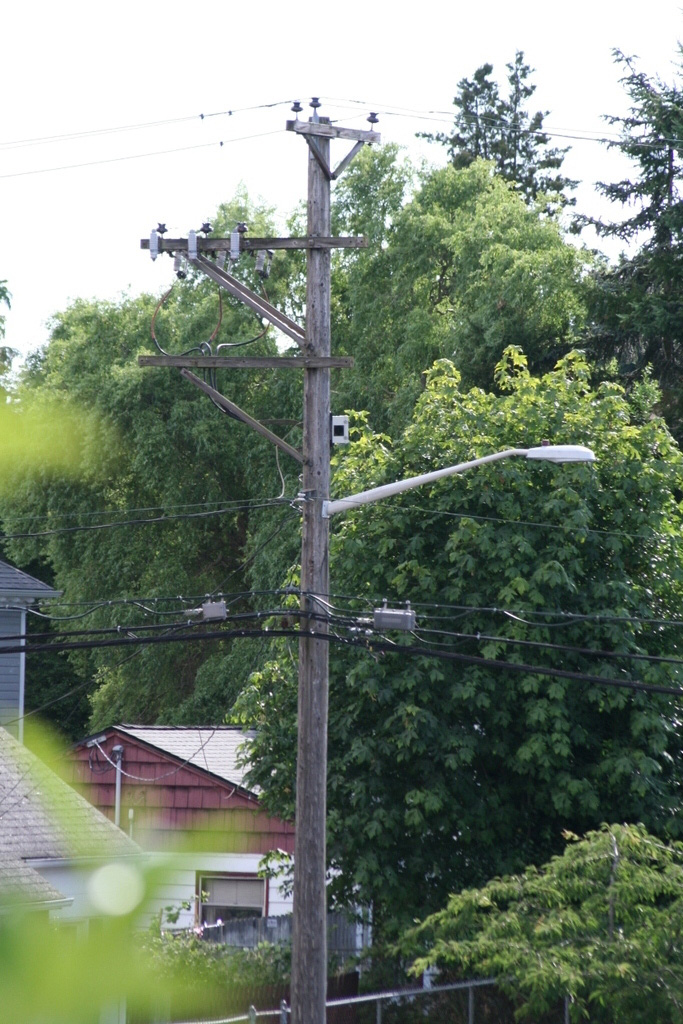 The residents of the Pitch Pipe Infoshop recently became aware of the existence of a hidden surveillance camera attached to a utility pole across from their house. The camera is hidden inside a box which is meant to resemble a standard electrical box. There are no other boxes like this on any of the utility poles in the immediate area. As the below picture shows, there is clearly a "camera-resembling-object" resting behind the transparent surface at the base of the box.