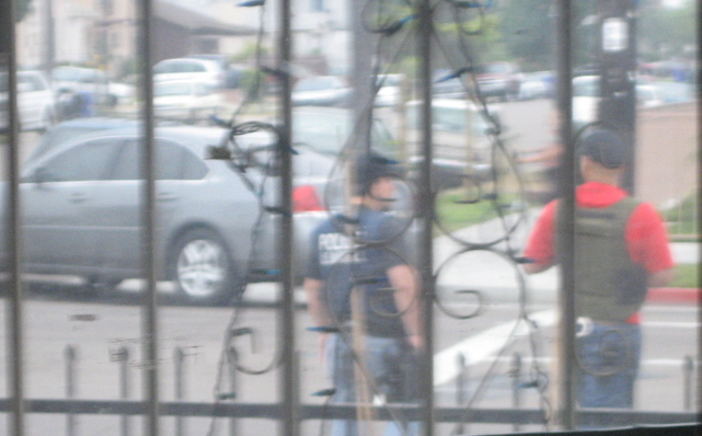The three men proceed to walk around the house, banging on it. We take some photos. What else can be done? Who are these men harassing our neighbors with guns drawn? US Marshalls usually accompany feds like the FBI and FCC, but here they're alone. Probably enforcing a warrant of some kind. They have parked their cars on the corner and in a neighbor's driveway haphazardly to begin their game of soldier with real stakes in our neighborhood.