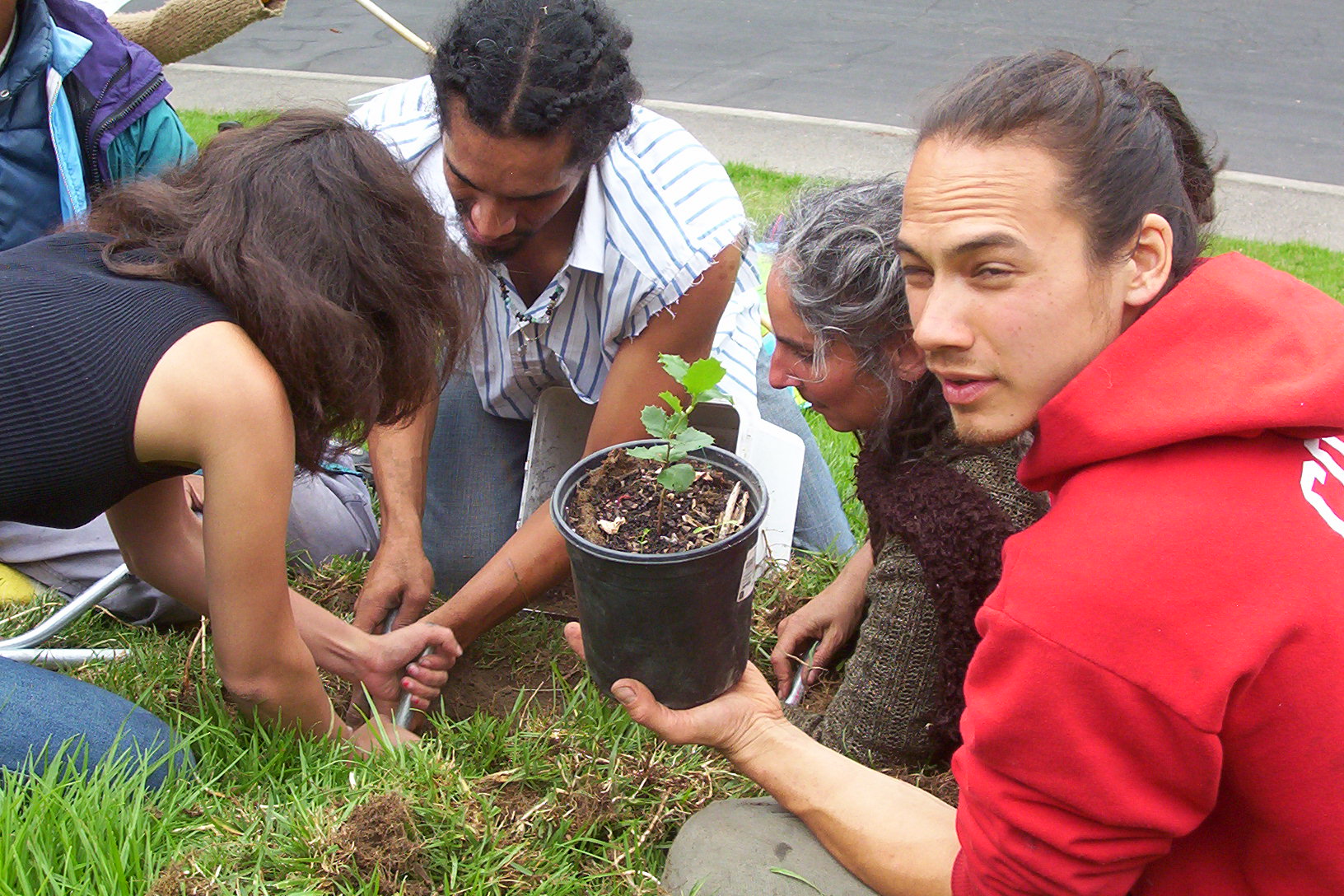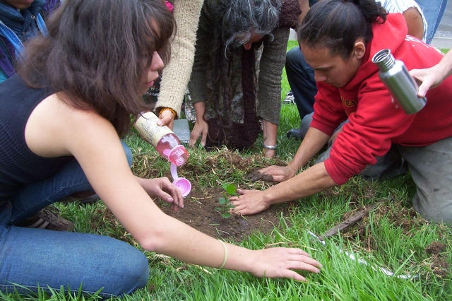 We gathered in a circle. A small oak seedling that was grown from an acorn from Memorial oak grove was placed in the middle. Several people went to it and began to dig a hole in the ground. The police came closer and filmed. The soil was hard and they scraped it away with sticks and bits of metal. Finally they had a nice hole ad planted the young tree. We relaxed around it and tried to imagine it in 200 years. Some people split off and headed up to the Oak Grove. In a bit we got a call. The police were arresting some of the people for damage to the lawn. More people rushed up there. Others headed off to get away but two cops cars sped after us and the cops arrested two more people for the supposed crime of planting a tree. Eventually five people were arrested for planting a small tree and one for objecting to the arrests.