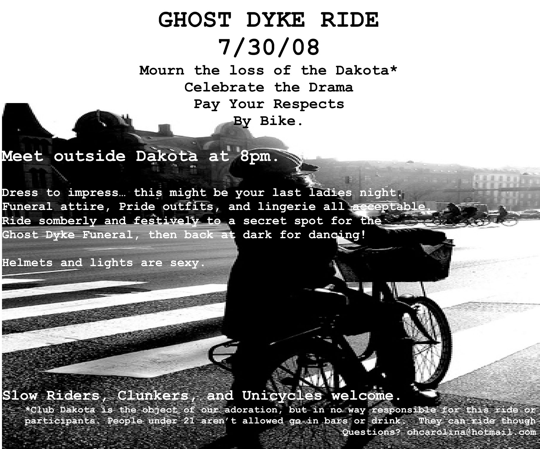The closing day is July 31st, which means Wednesday is the last Ladies Night. We will meet at 8PM out front of the Dakota (earlier if you want a pre-ride drink) and ride in a mellow fashion to to a secret spot to hold the Ghost Dyke Funeral. The ride will return to Dakota before it's totally dark.