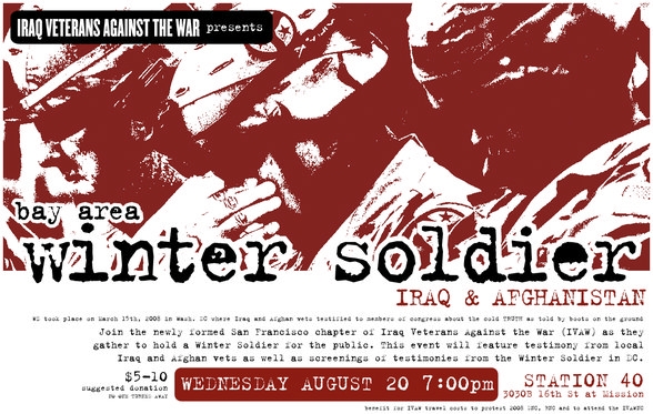 Join the newly formed San Francisco chapter of Iraq Veterans Against the War (IVAW) as they gather to hold a Winter Soldier for the public. This event will feature testimony from local Iraq and Afghan vets as well as screenings of testimonies from the Winter Soldier in DC.