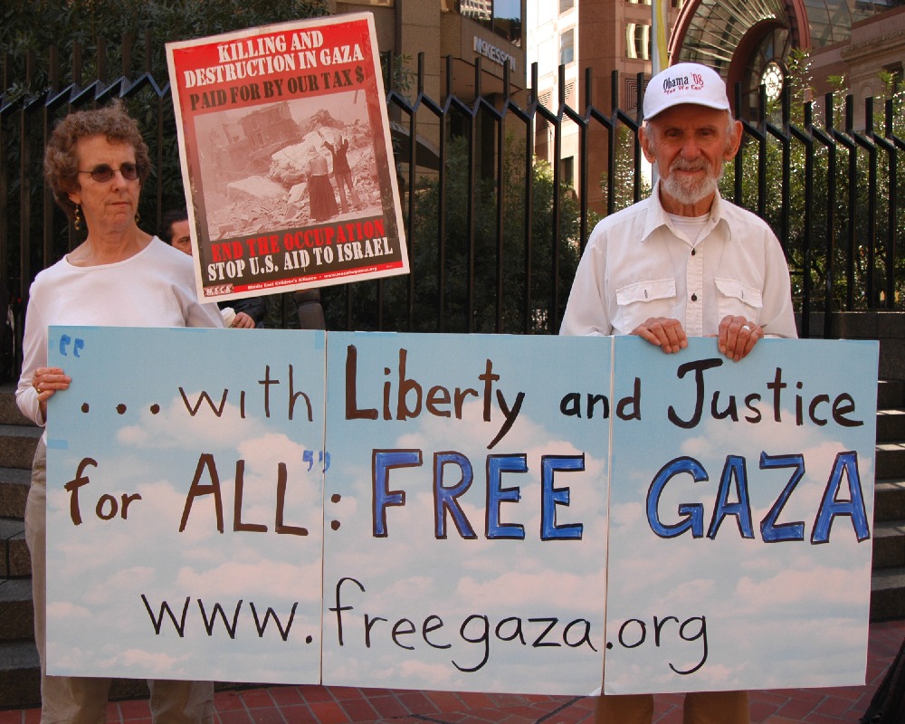 In response to Israeli threats to intercept and board the boats, residents of the San Francisco Bay Area demonstrated their support for the Free Gaza activists on Thursday, 21 August 2008. They gathered in front of the office of Senator Diane Feinstein at One Post Street in downtown San Francisco to demand that members of Congress use their power and influence to protect the non-violent human rights activists in the event that the Israeli Navy moves to intercept the boats.