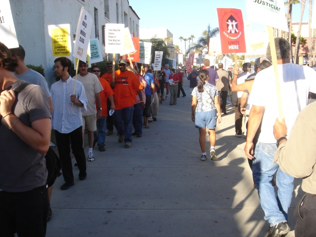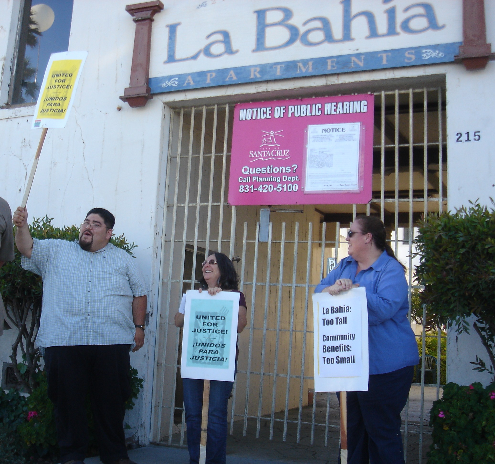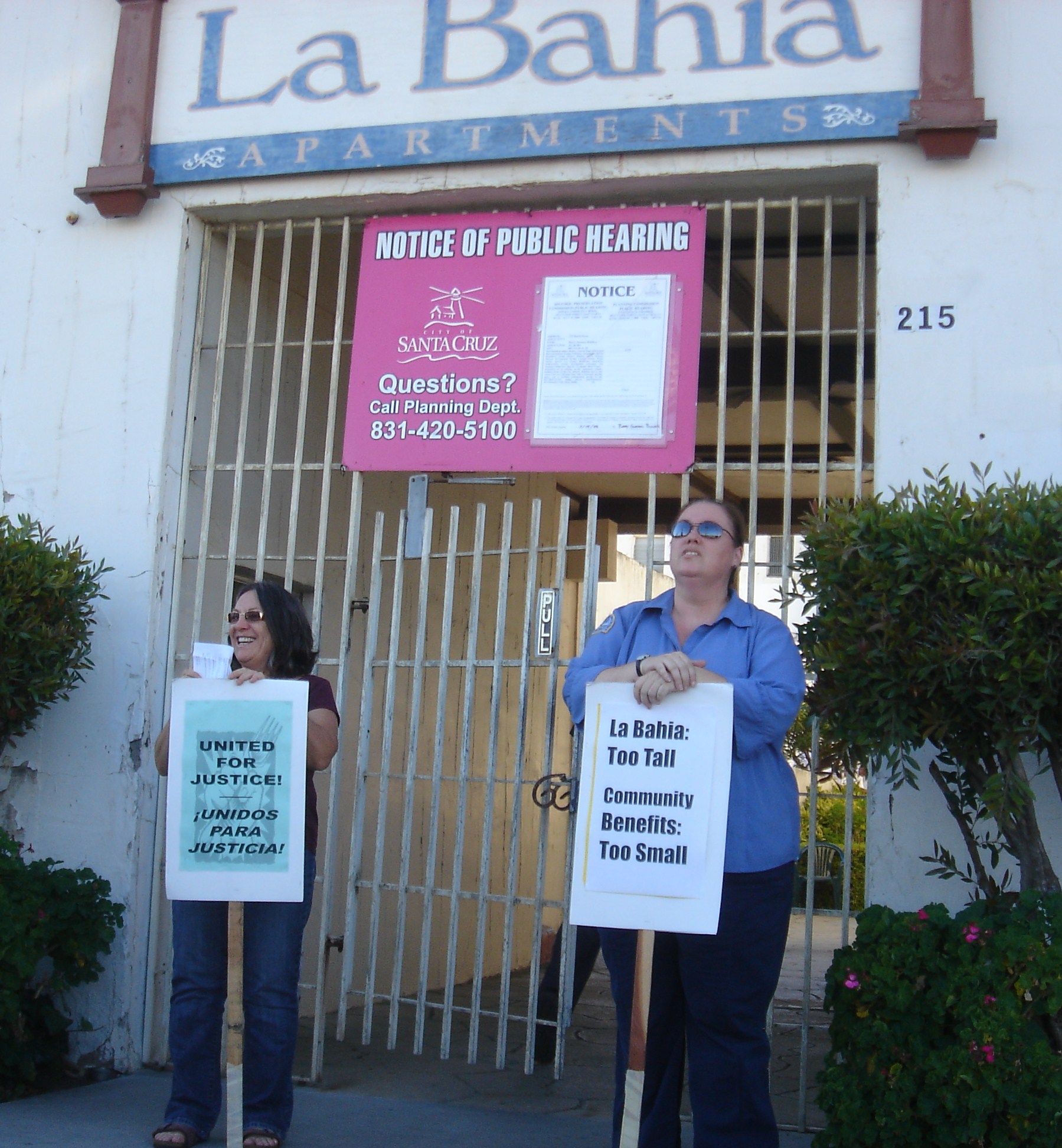 On August 21st, 2008 labor unions, community leaders, politicians, and residents came together to protest the La Bahia Expansion. The City of Santa Cruz and the Seaside Company want to expand the La Bahia Hotel into a 74 feet tall hotel/conference center right next to the beach. This building will hurt and harm the environment, and on top of that they are trying to build the hotel with non-union workers and later staff it with non-union employees.