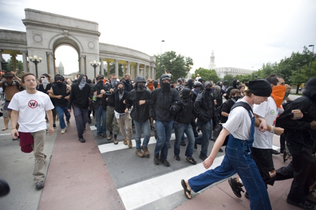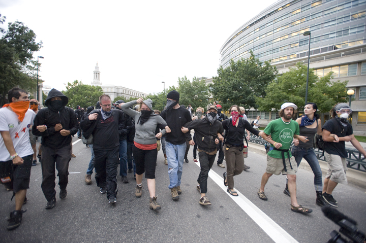 The anti-capitalist march started at Civic Center Park just after 6 p.m. Nearly 500 protesters were met with riot police using pepper spray in front of the Denver City and County Building, but protesters pulled a fast one and put the cops at their backs as they marched across the park to Colfax and 15th Street.
