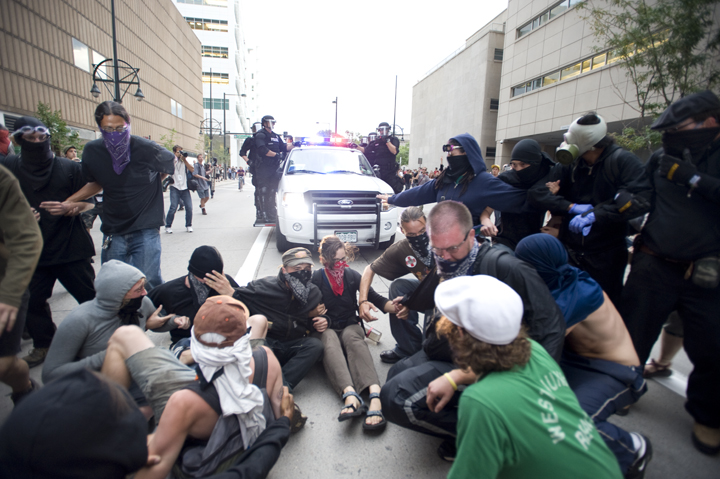 About 50 people who found themselves on the street where arrested and taken to a temporary holding facility set up by the Denver Police Department that activists have renamed "Gitmo on the Platte." At one point police arbitrarily released around 50 protesters from the street to the sidewalk police line.