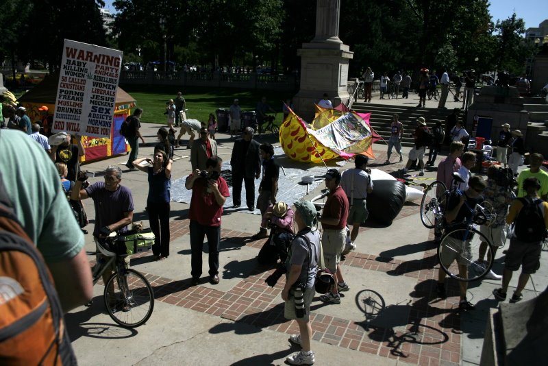 On the morning of Tuesday August 26, 2008, the Backbone campaign had a permit for a march leaving from Civic Center Park in Denver, and proceeding towards the DNC convention center. Early reports are that some participants in this march were arrested for trying to send away an abrasive anti-gay christian group that entered their group and was engaging in harrassing, invasive behavior. There was some yelling, and people tried to hold signs in front of their signs, and despite the fact that the backbone campaign held the permit, the provokers were given quite a bit of tolerance by police. The police charged someone for pulling a bullhorn cord.