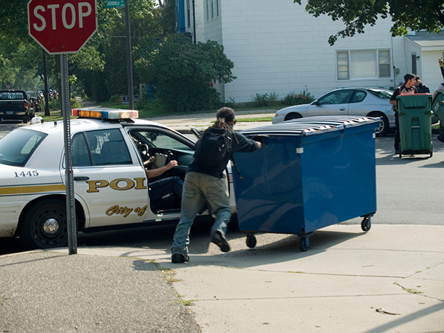 A group of people were followed by St. Paul police in their car. Some people in the group began to push garbage cans down a residential street. More police quickly arrived on the scene, jumped out of a black tactical van, pepper sprayed the group and then tackled three people. Three people in the group were handcuffed, searched and taken away in the back of police cars.