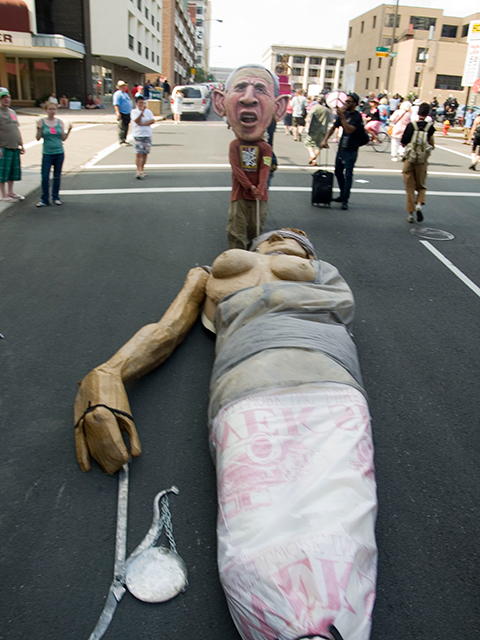 On September 1st, over ten thousand people marched in the streets of St. Paul, Minnesota to protest the Republican National Convention while demanding peace, justice and equality. The permitted demonstration, with over two years of planning, was organized by The Coalition to March on the RNC and Stop the War. The Coalition is made up of more than 130 organizations, including anti-war coalitions in the U.S, immigrant rights organizations, trade unions, low income and community groups.