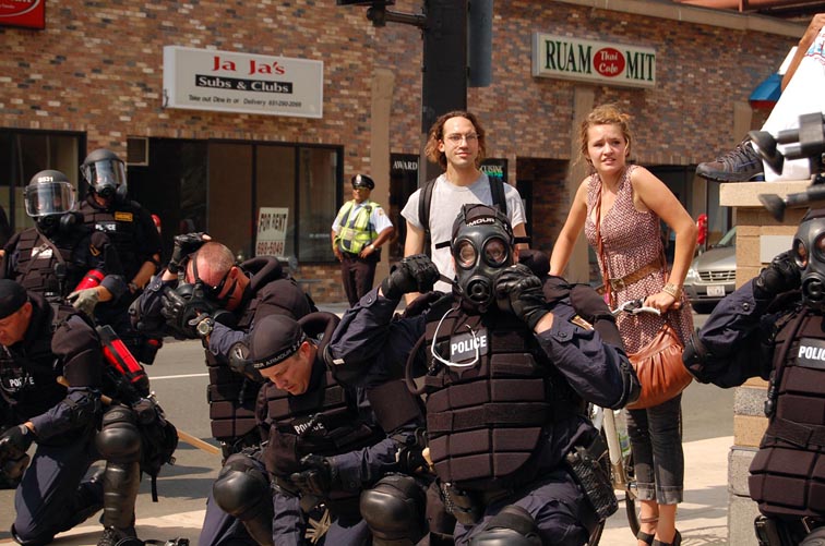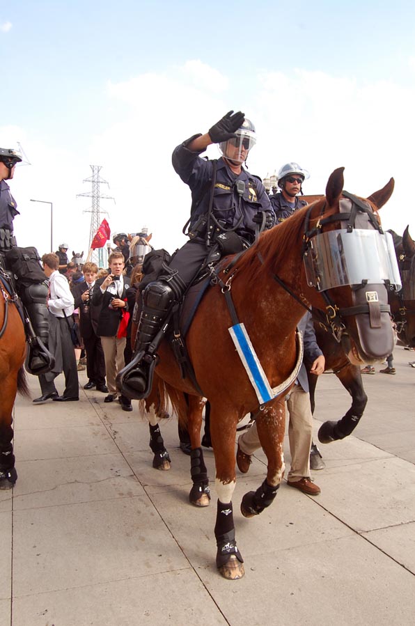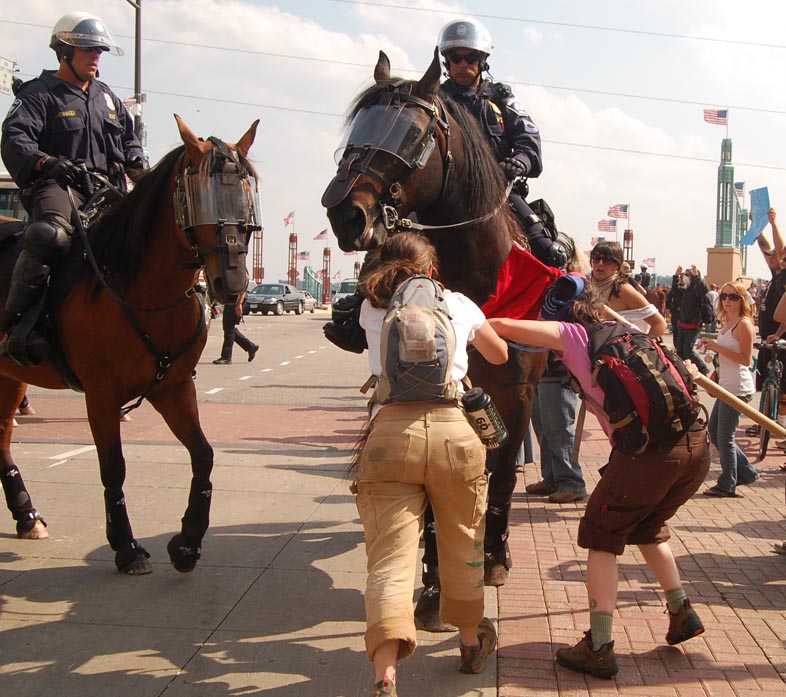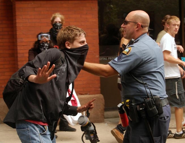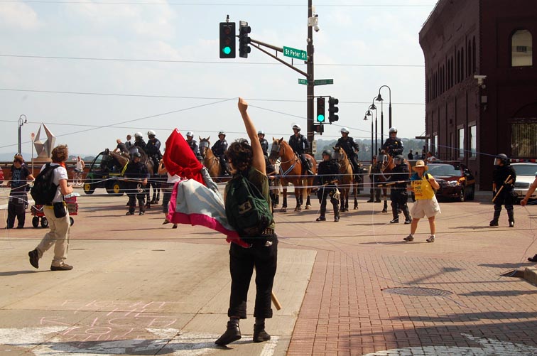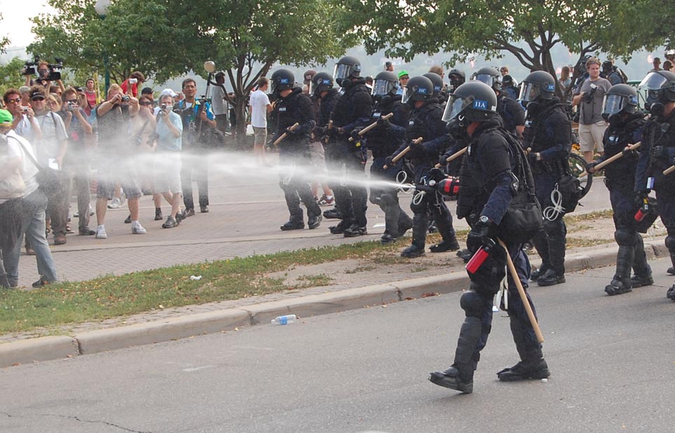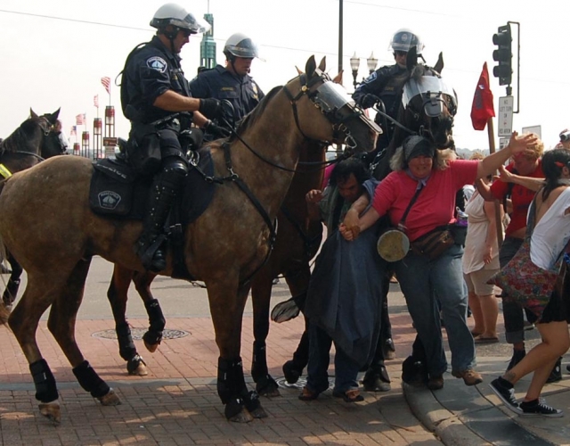 On September 1 2008 people from all over the country came to St Paul to protest the RNC. The actions of the police throughout the day should be seen as a violent act of aggression to all people. Their brutality towards anti war protesters was nothing new.... in confrontations with the state such as this it becomes clear which side you are on. Please notice the lengths to which the police protect/ harbor delegates...while throughout the day I personally witnessed numerous outrageous acts of police brutality. The police systematically trapped people who were there to peacefully protest from participating in the permitted march. They picked off people on the street who looked as though they might be protesters.