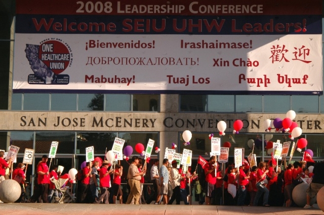 The hotel workers’ march coincided with the 2008 Leadership Conference of SEIU (Service Employees International Union) United Healthcare Workers - West, taking place in the San José McEnery Convention Center. Hotel workers marched through the convention center, chanting slogans of solidarity with healthcare workers. In return, some SEIU-UHW healthcare workers joined in solidarity with the hotel workers’ march.