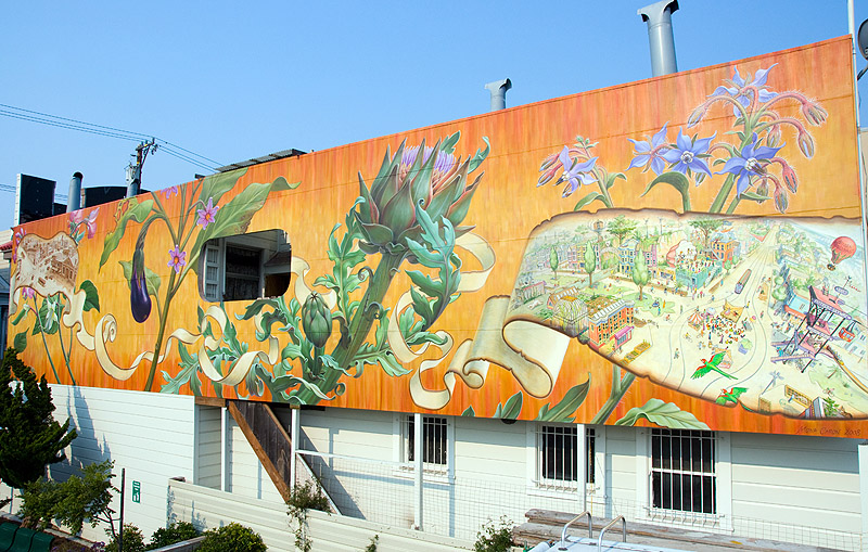 Unveiling to celebrate the completion of Mona Caron's Noe Valley murals: a festive eco/utopian and localist San Francisco scene in the lot between the two murals.