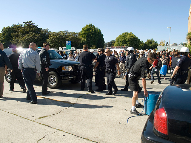 On September 17th, two people were arrested in Parking Lot #4 alongside the Santa Cruz Farmer's Market. Police lined Cathcart Street displaying batons and a riot control gun, but quickly drove away, while seditious beats emanated from the drum circle below the trees. People continued to play music, share food and enjoy their time in Parking Lot #4 without further disturbance from the police or fencing.