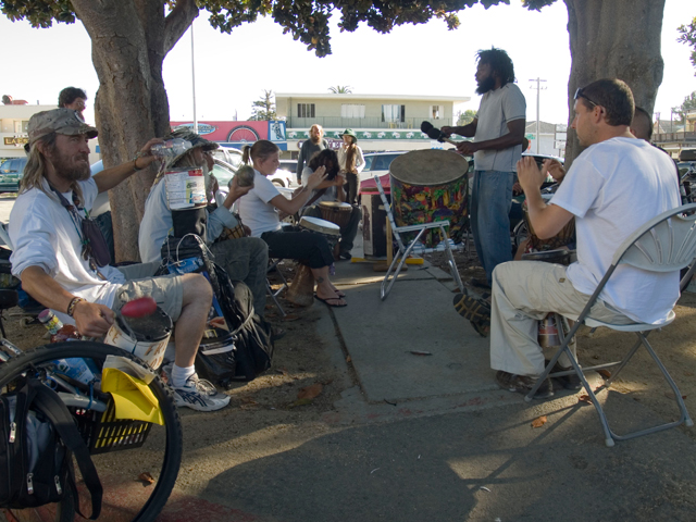 However by 3:30 PM, the fences had been taken down and a small cadre of drummers seated drumming. By 5 PM the drum circle had trippled in size and the number of observers grown to a crowd of 50-70.