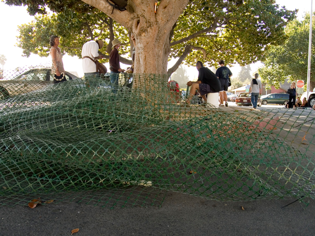 For the last two weeks, uniformed police haven't stalked Parking Lot #4, where drummers have drummed for 10 years next to the Farmer's Market. Still the city, apparently at the instigation of the police have regularly erected plastic green mesh enclosures on stakes pounded into the ground around the area where the public normally assembles. And the community, regularly, takes them down and reclaims the public space. Will the city spacesnatchers wise up this Wednesday? Come on down and help them regain their sanity.
