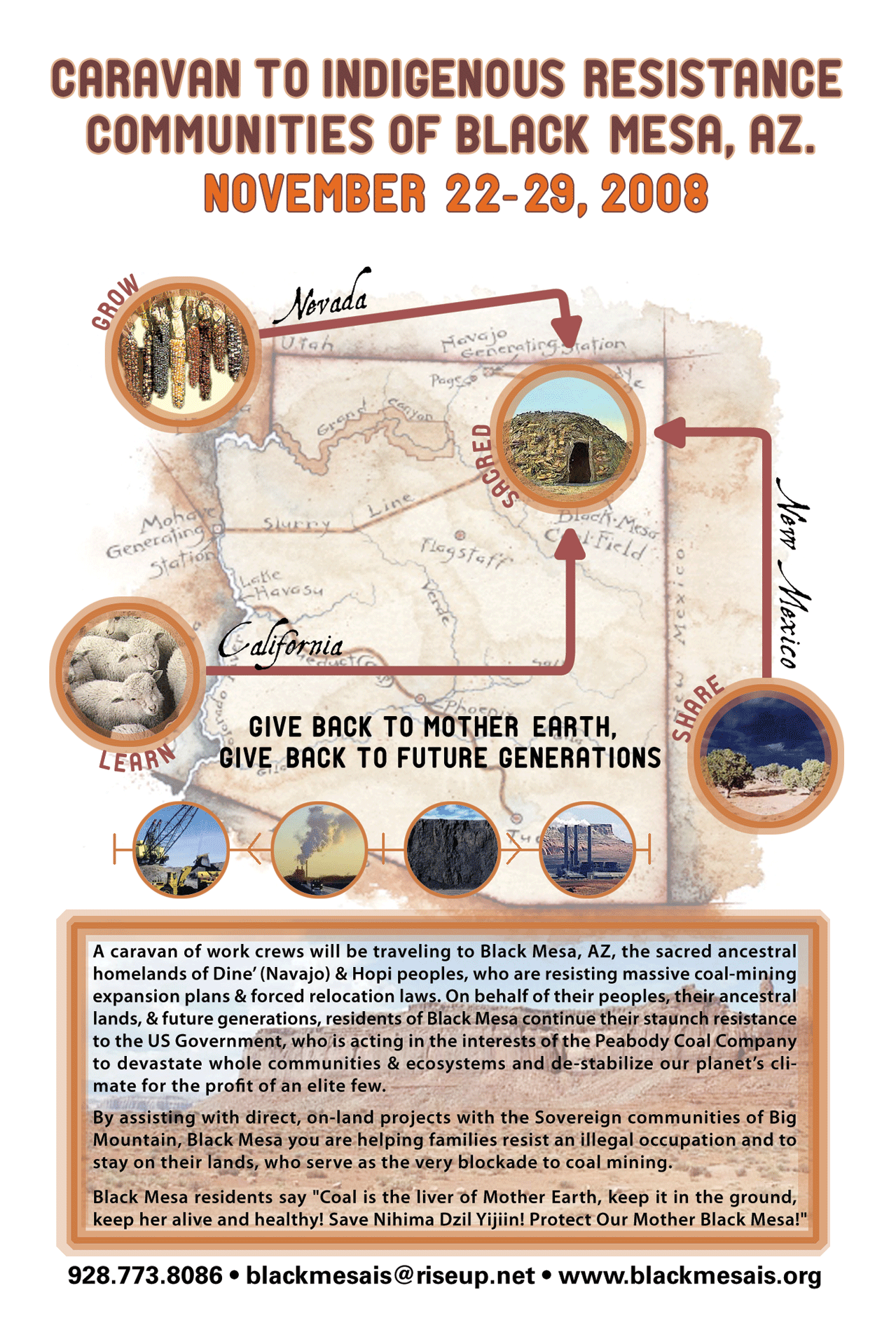 A caravan of work crews that will be converging from across the country to support residents of the Big Mountain regions of Black Mesa who, on behalf of their peoples, their sacred ancestral lands, and future generations, continue to carry out their staunch resistance to the efforts of the US Government, which is acting in the interests of the Peabody Coal Company to devastate whole communities & ecosystems, and greatly de-stabilize our planet's climate for the profit of an elite few.