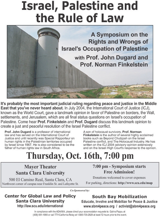 Prof. John Dugard -- father of human rights law in South Africa, a judge on the World Court, and former UN Special Rapporteur to Occupied Palestine will be joined by Norman Finkelstein, author of Beyond Chutzpah, as well as a Zionist lecturer, David Meil Levy