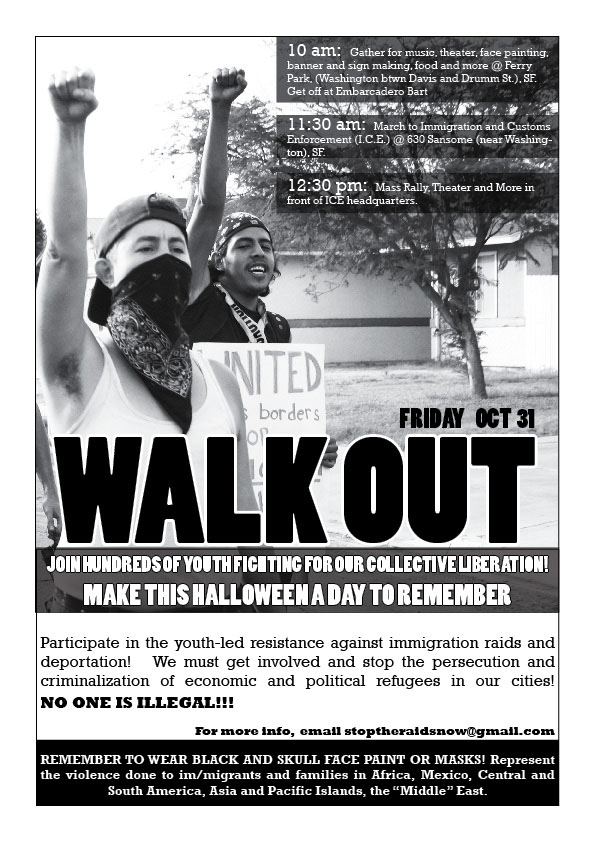 Hundreds of high school and college age youth, from Oakland, Berkeley, Richmond, San Francisco, San Jose, San Lorenzo, San Leandro, Santa Cruz, Sacramento, and Hayward gather with community members and families to denounce the atrocities committed against the immigrant communities by Immigration Custom Enforcement (ICE). This Halloween the festivities are left aside in order to shed light on the attacks that have been happening against immigrant and working class communities in these so called 'sanctuary cities.' Young people take the fore-front inorder to say 'Enough is Enough' – we need an immediate End to all ICE Raids, We need to shut down all detention Centers and we need to have REAL Sanctuary Cities.
