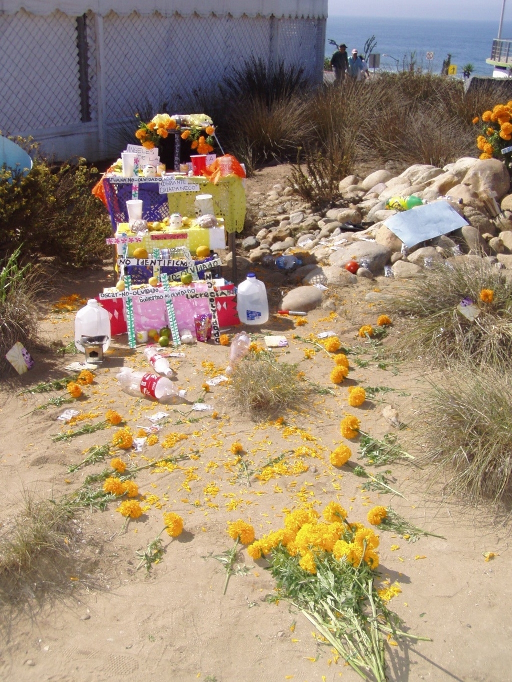 So today, standing in Tijuana, with my Mexican family; I watch as Border Angels put names on the paper ribbons, attach them to that perverted fence to show the world that some of us will never forget the deaths and that we will fight like hell for those to come. Here, this morning, the day before Dia de los Muertos, human rights supporters have gathered on both sides of the fence to hear Enrique Morones, founder of Border Angels, tell international media, including a news crew from CNN, that his group will continue "savings lives and making a difference."