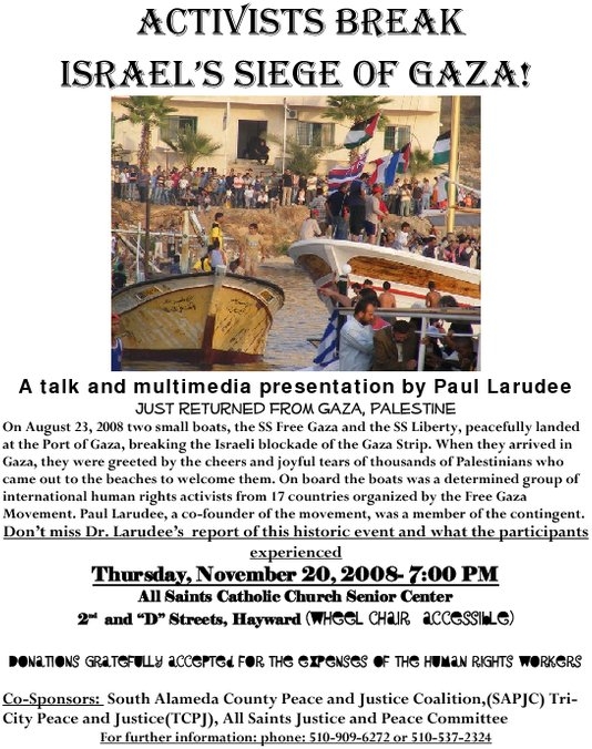 On August 23, 2008 two small boats, the SS Free Gaza and the SS Liberty, peacefully landed at the Port of Gaza, breaking the Israeli blockade of the Gaza Strip. When they arrived in Gaza, they were greeted by the cheers and joyful tears of thousands of Palestinians who came out to welcome them. On board the boats was a determined group of 44 international human rights activists from 17 countries organized by the Free Gaza Movement. Paul Larudee, a co-founder of the movement, was a member of the contingent. Don't miss Dr. Larudee's report of this historic event and what the participants experienced.