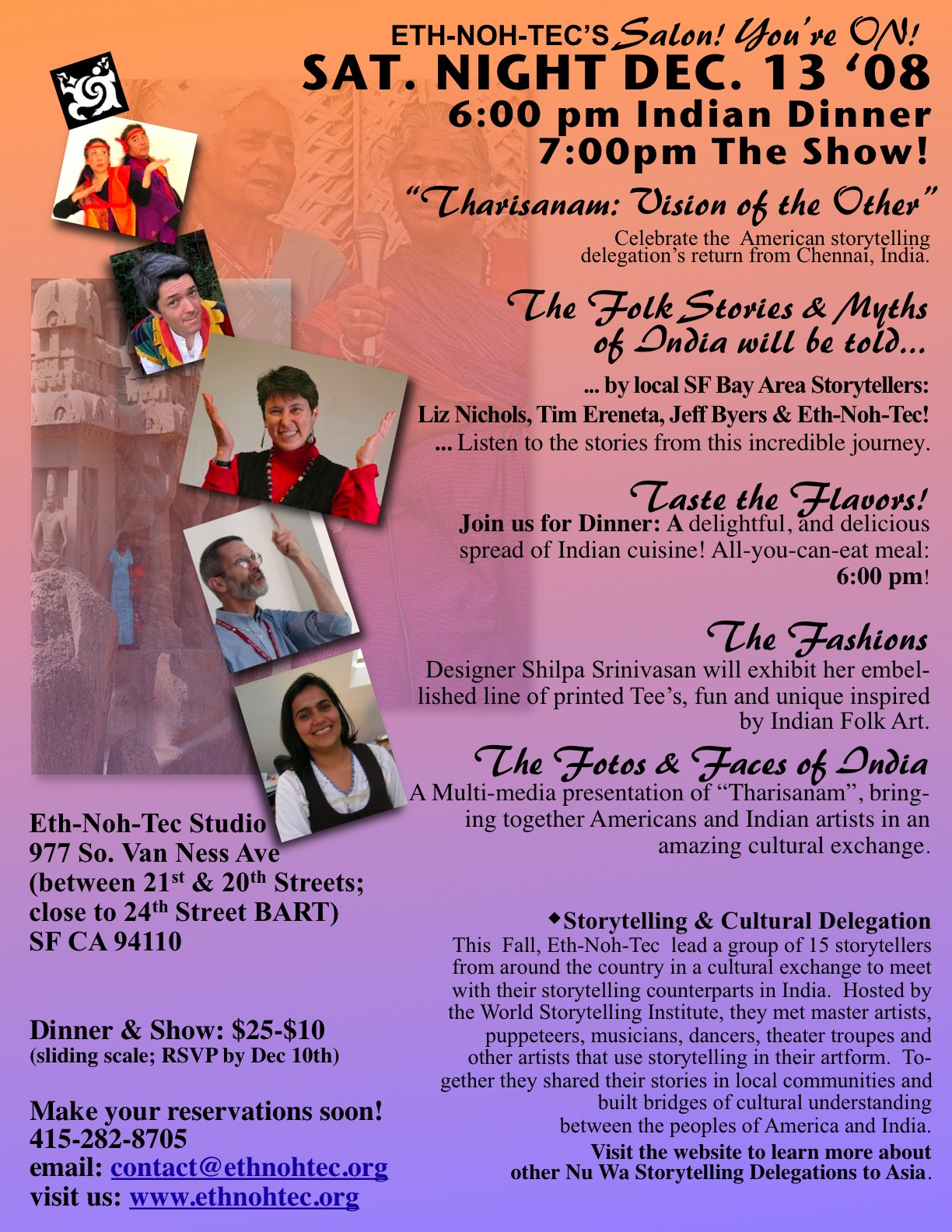 Celebrate the American storytelling delegation’s return from Chennai, India. The folk stories & myths of India will be told by local SF Bay area storytellers Liz Nichols, Tim Erenata, Jeff Byers, and Eth-Noh-Tec. Listen to the stories from this incredible journey.