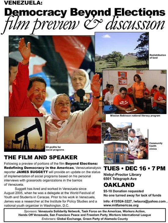 Following a preview of portions of the film “Beyond Elections: Redefining Democracy in the Americas”, Venezuelanalysis reporter James Suggett will provide an update on the status of implementation of social programs based on his personal interviews with grassroots organizations in the barrios of Venezuela.
