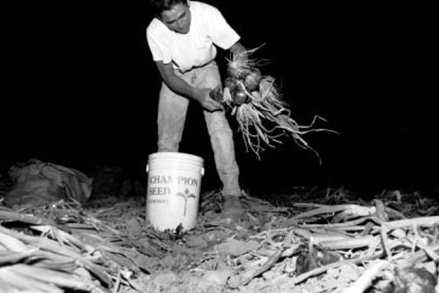 At sunset, at the southern-most end of the San Joaquin Valley, a crew of indigenous workers cut the tops and roots off bunches of onions. (Photo: David Bacon)
