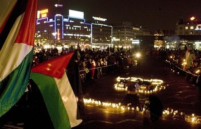Protesters take part in a rally against Israel's air offensive in Gaza Strip, in front of the Israel embassy in Tokyo December 30, 2008. About 200 protesters participated in the rally criticizing Israel. The banner reads, "Stop air assault on Gaza.