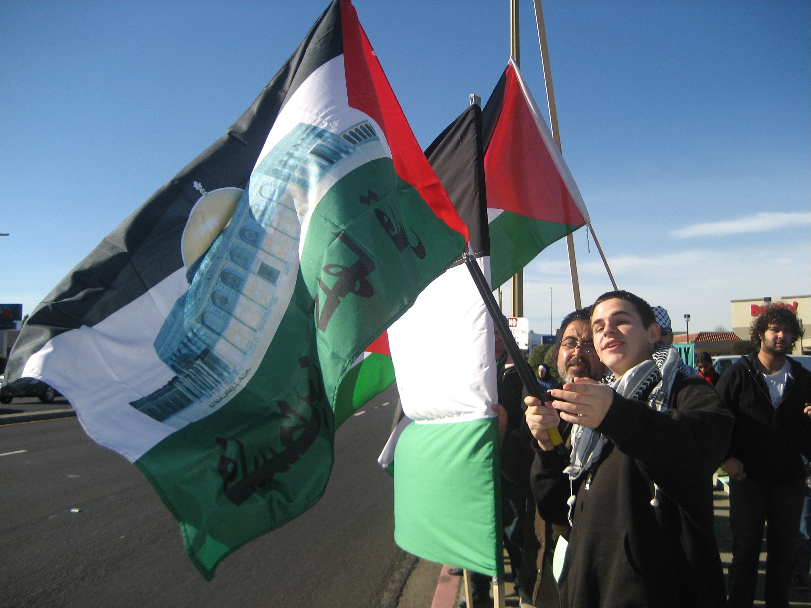 A group named *Oy Bay* called for a counter protest. At noon there were about 3 pro-Israel demonstrators who taunted the Gaza supporters as they arrived but within minutes they were overwhelmed by the pro-Palestine crowd and disappeared. It looked to be over one thousand, though the TV news said hundreds, who came out to show the world that the South Bay wants the Israeli aggression to halt!