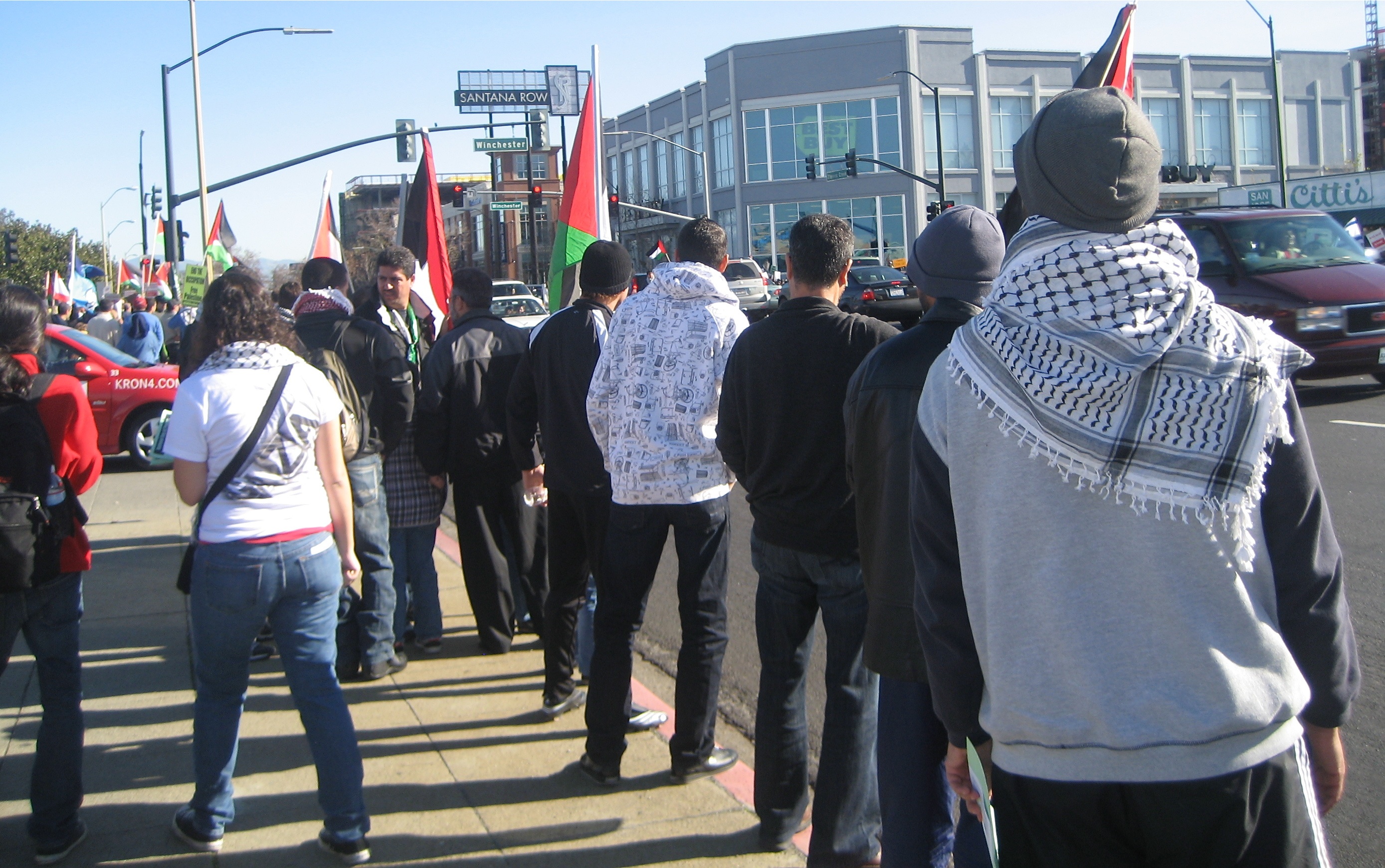 Between a thousand and two thousand marchers showed that San Jose and Santa Clara County residents will not stand for the Israeli attack on Gaza! Many of them moved from a rally that spanned the intersection of Stevens Creek and Winchester's busy biways to tony Santana Row where high end shoppers were treated to a scene like no other.
