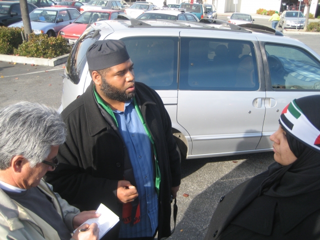 Interviews with media; signing up to send messages via CAIR to elected representatives; placards raised to alert motorists; discussion.