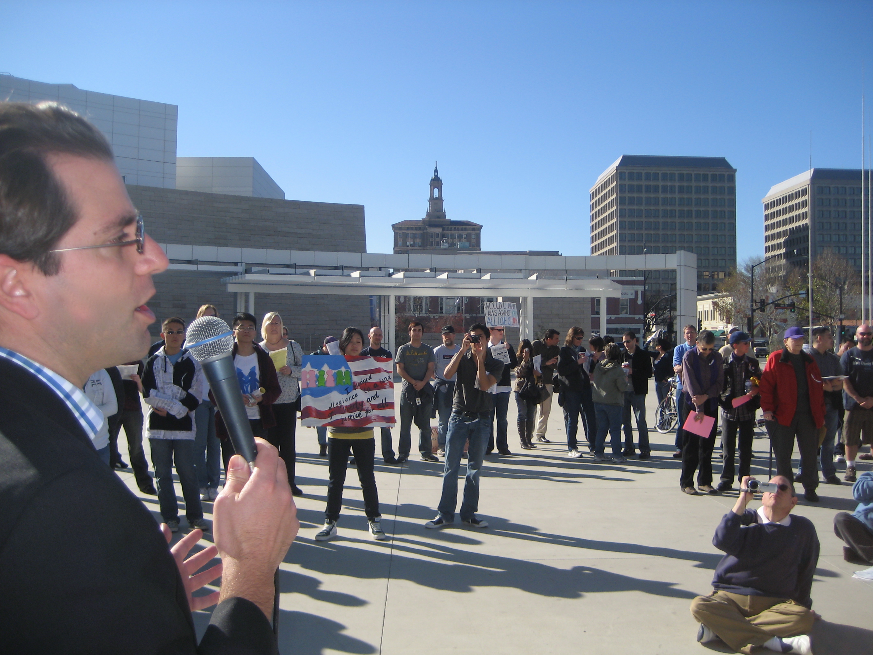 Top photo of Evan Low, Vice-Mayor of Campbell addressing the crowd of about 100. All photos by R. Robertson for indybay.org