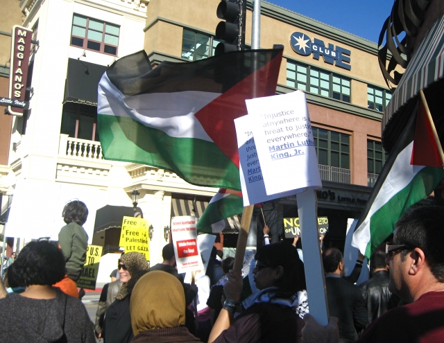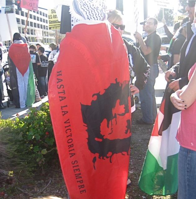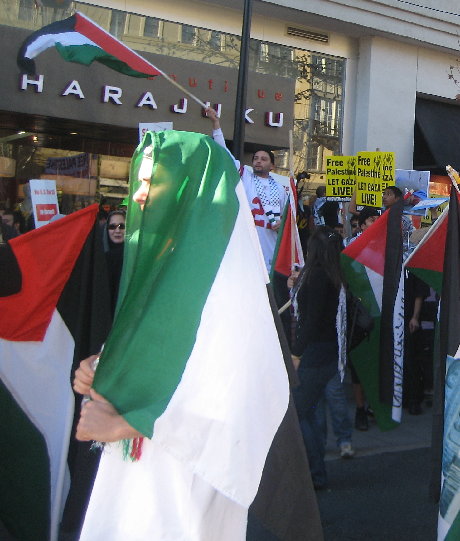 The colors of the Palestinian flag were popular at the January 11 demo of over 1,000 people in San Jose, California. Men and women alike chose to make a "fashion statement" with their clothing.