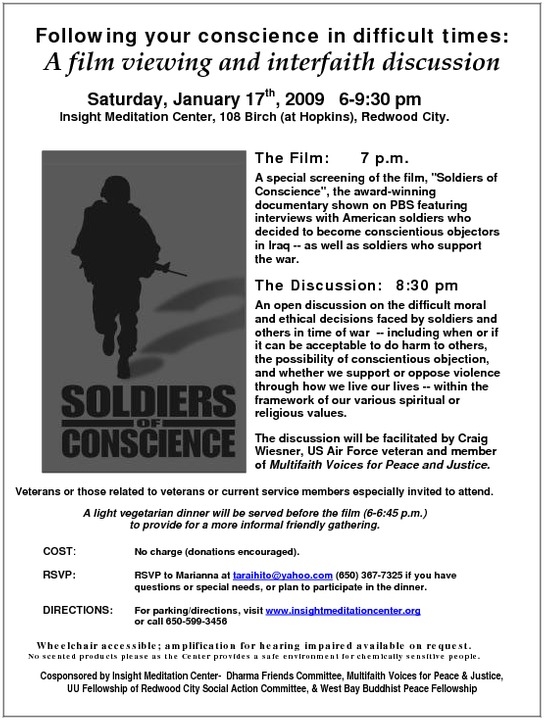 Cosponsored by Insight Meditation Center - Dharma Friends Committee, Multifaith Voices for Peace & Justice, Unitarian Universalist Fellowship of Redwood City Social Action Committee, & West Bay Buddhist Peace Fellowship.