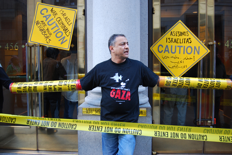 SAN FRANCISCO – A group of nine anti-Zionist activists – Palestinian, Jewish, immigrant rights and prison abolitionists chained themselves to the Israeli Consulate today to protest Israeli apartheid and its current attacks on Gaza. Protestors support: an immediate ceasefire; the opening of land, sea, and air borders to allow in emergency supplies; and an end to US financial and political support for Israel.