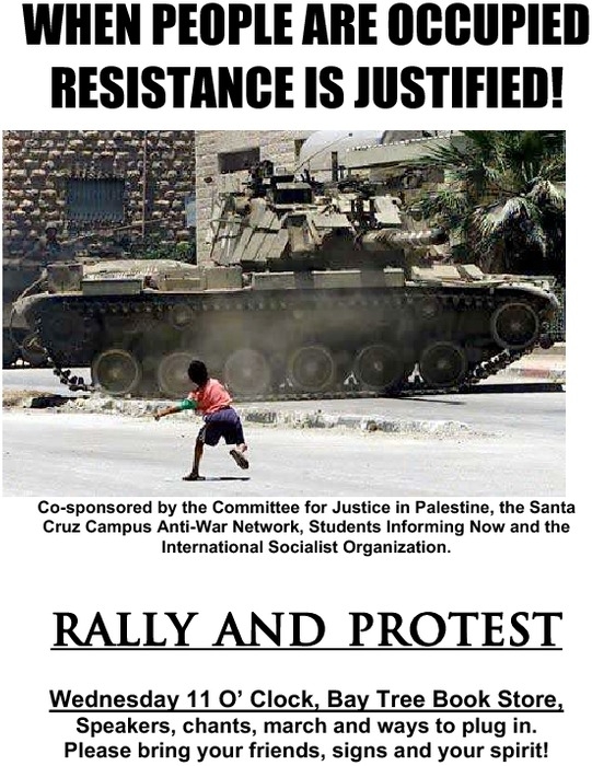 Co-sponsored by the Committee for Justice in Palestine, the Santa Cruz Campus Anti-War Network, Students Informing Now and the International Socialist Organization.