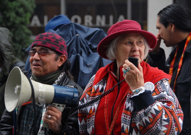 On short notice the American Indian community and their supporters came out in the rain today in San Francisco to protest this attack on Leonard Peltier. Family members of Leonard feel this cowardly assault was orchestrated by the FBI to prejudice his next parole hearing. Today's demonstration began at the new federal building and then marched to the Phillp Burton Federal Building. Tony Gonzalez, Director of AIM West, led a delegation inside to house leader Nancy Pelosi's office to demand a congressional hearing into the attack on Leonard and the policies of all federal prisons. To keep up to date on these developments contact AIM-West at 415-557-1492 or gazelbe [at] yahoo.com