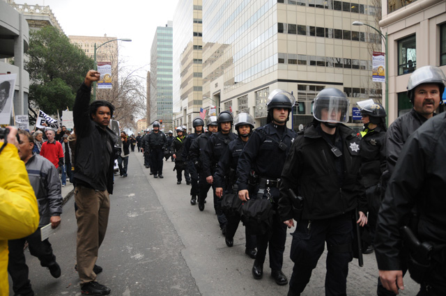 This sickening display of naked state violence – aimed at physically preventing people from joining the rally and march and intimidating and terrorizing those who did come -- came after a week of battles with the city to even get a sound and march permit – despite having no legal grounds for the denial – prompting protests from the ACLU and Amnesty International. This battle continued throughout the rally and right up to the moment the march left Frank Ogawa Plaza, with march organizers and their attorneys going toe to toe with the police and city officials.