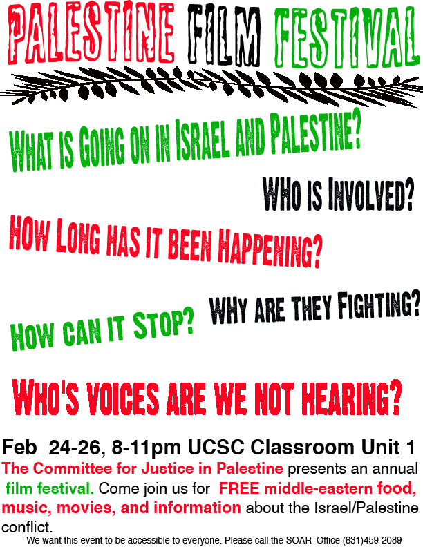 Committee for Justice in Palestine is sponsoring a three-day film festival, featuring the culture and perspectives of the Palestinian people and the voices of silenced Israelis.