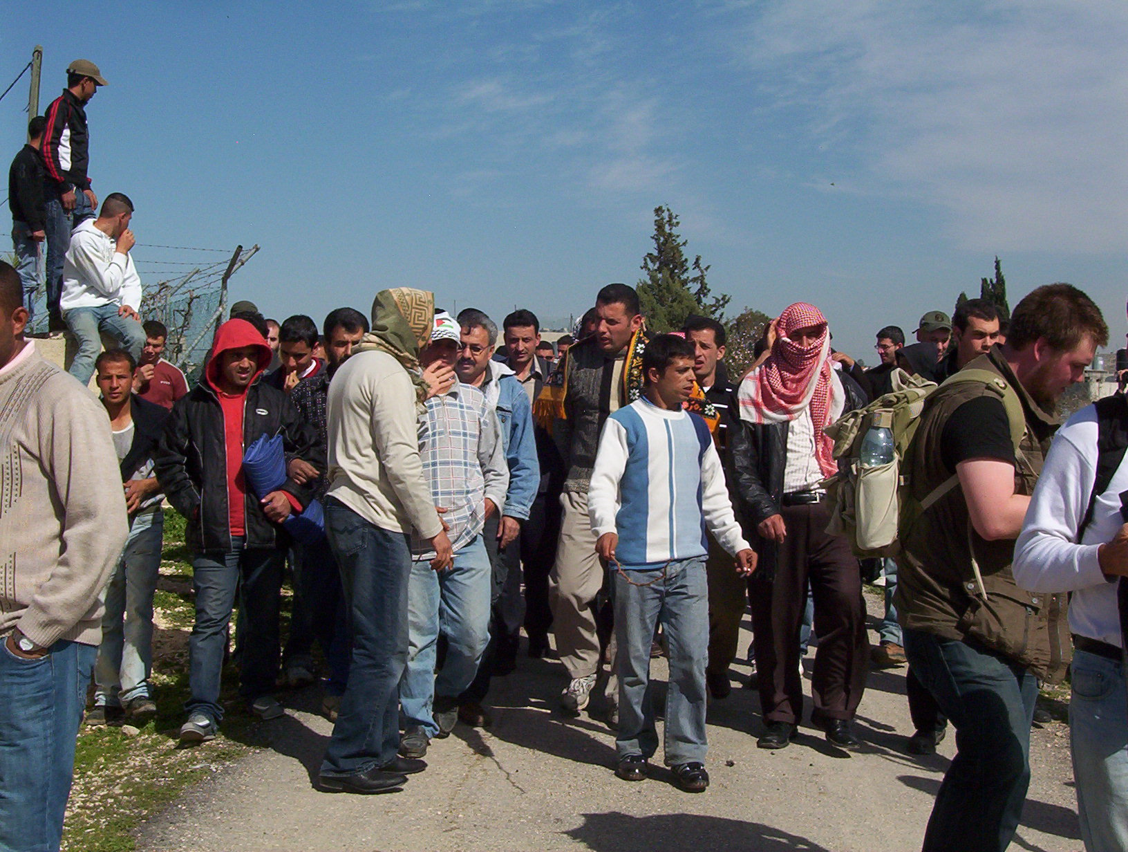Friday Muslim prayers were going on. When they finished we started a march to the Walls construction site. Two groups of Israeli soldiers and several jeeps were visible in the villages olive groves, ready to attack the march. The wall will steal much of the villages land. Two nearby Israeli settlements are set to expand. We began to march and made it several hundred feet. Then the teargas came flying in. The march was on the villagers own land and nowhere near the wall construction site. People ran and tried to avoid the gas. More grenades came flying in and filled the area with teargas. The march retreated and broke up. The Palestinian youths put on kafiyas or t-shirt masks and got out sling to throw rocks at the soldiers. The Israeli group Anarchists Against The Wall, foreign activists and journalist also were teargassed as they supported the protest or filmed it. For hours the soldiers fired teargas into the village. Twice they charged into the village with armored jeeps. Palestinians threw rocks and the soldiers fired hundreds of teargas grenades, concussion grenades and rubber coated steel bullets.
