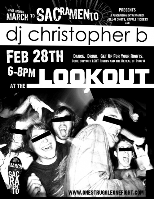 The March to Sacramento is throwing a fundraising party at the Lookout. Come in support of LGBT rights and the repeal of Prop 8! There will be jello shots and raffles, along with music spun by dj christopher b. Come find out about the march, participate, donate, drink and dance for your CIVIL RIGHTS!!!!