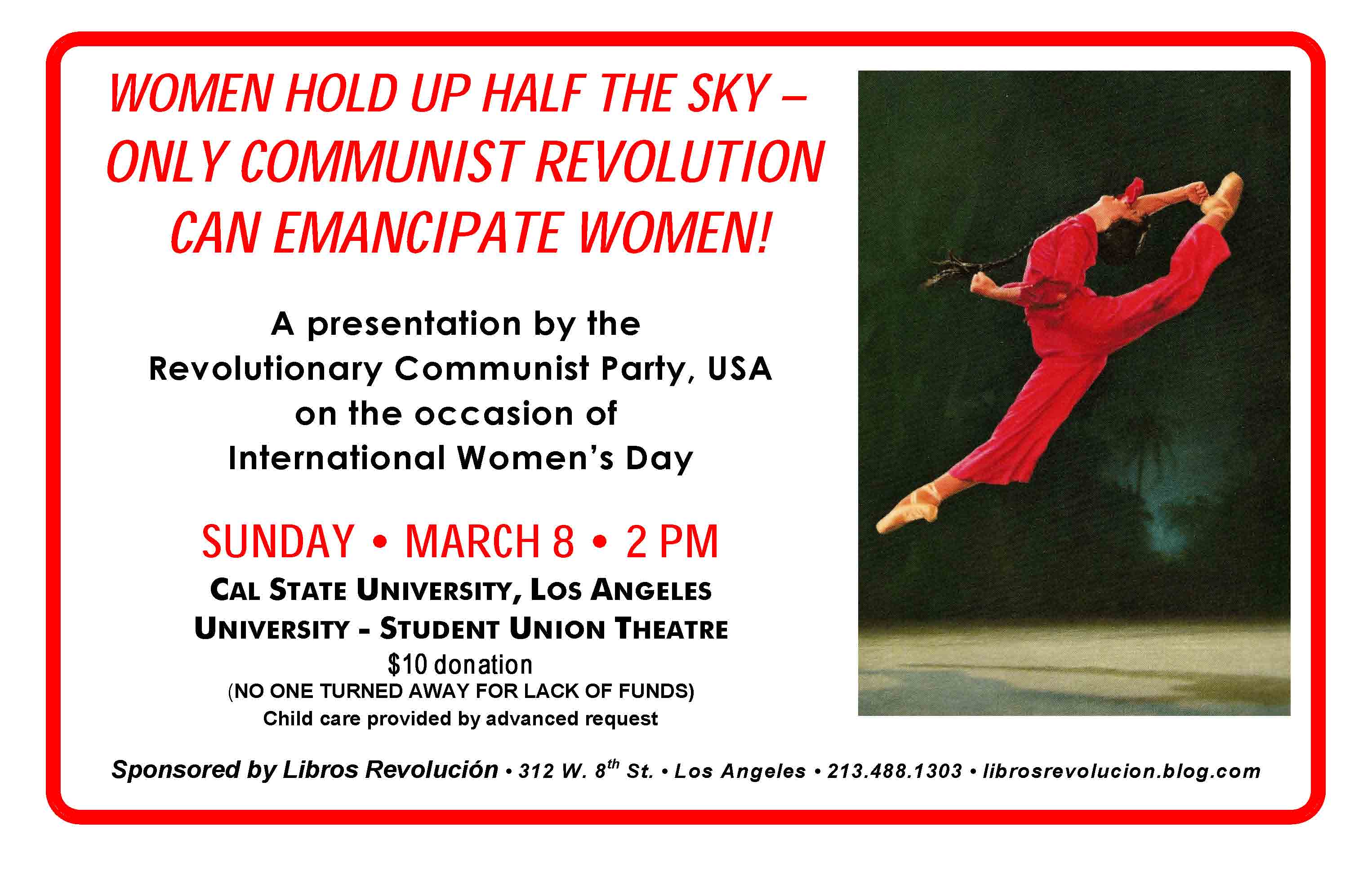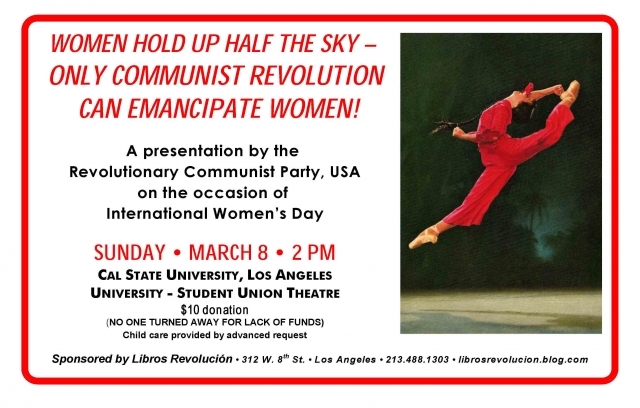 On March 8, at 2:00 p.m. at the Student Union Theatre at the California State University, Los Angeles, there will be a presentation by the Revolutionary Communist Party, USA “Women Hold Up Half The Sky – Only Communist Revolution Can Emancipate Women!”